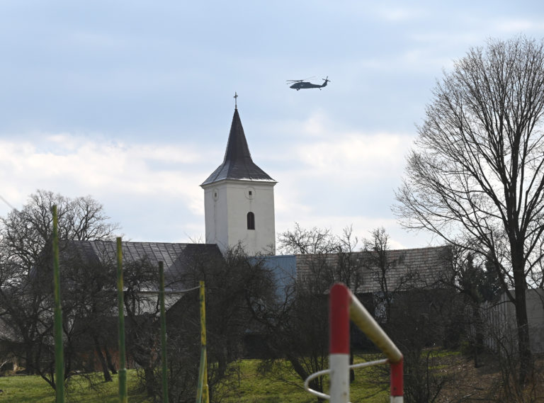 Vrtuľník Ozbrojených síl nad obcou Jarovnice počas testovania ľudí, ktorí prišli zo zahraničia do rómskej osady v Jarovniciach v rámci mimoriadnej situácie v súvislosti s ochorením COVID-19 spôsobeným koronavírusom (2019-nCoV) na Slovensku. Jarovnice, 3. apríl 2020. Foto: SITA/Viktor Zamborský