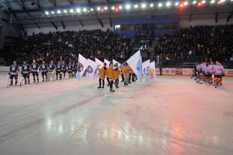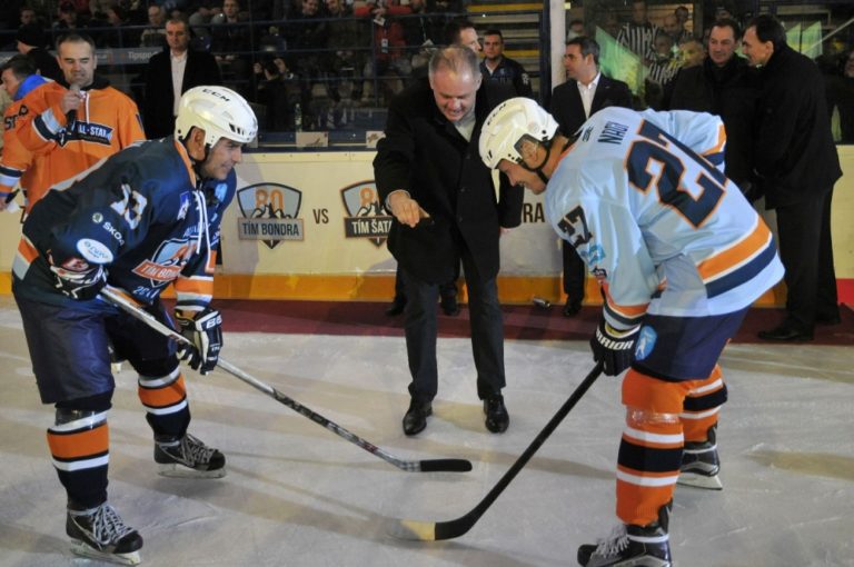 Prezident SR Andrej Kiska (uprostred) vhadzuje buly počas hokejového Zápasu hviezd Tipsport ligy. Poprad, 29. január 2017. Foto: SITA/Radoslav Maťaš