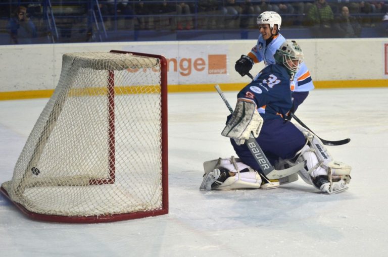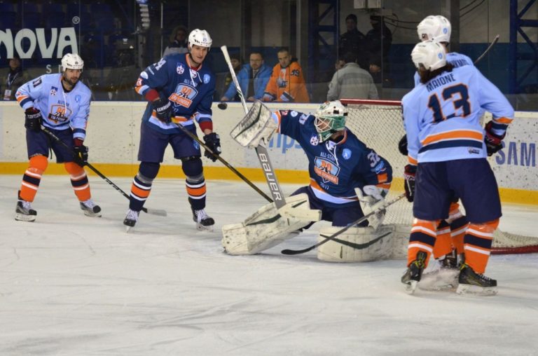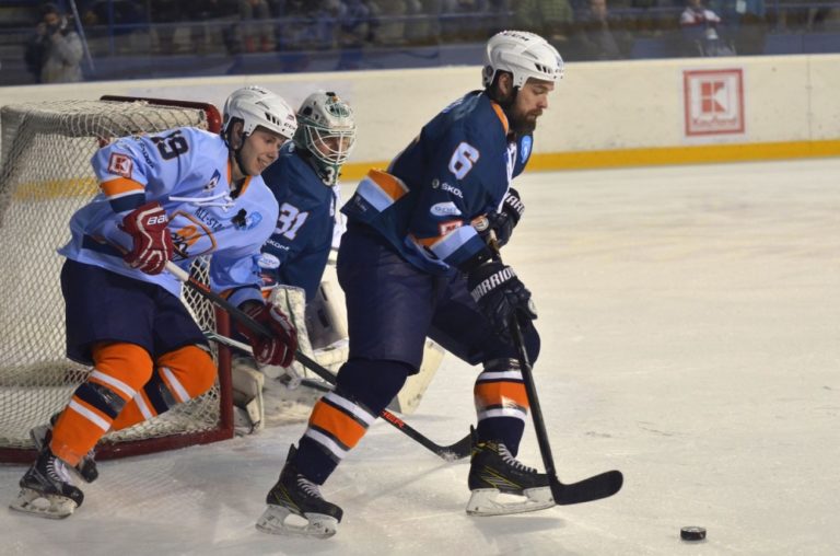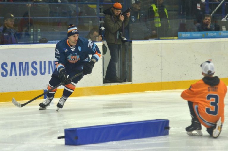 Zľava: Martin Dudáš z tímu Šatan a Branislav Mezei z tímu Bondra počas hokejového Zápasu hviezd Tipsport ligy. Poprad, 29. január 2017. Foto: SITA/Radoslav Maťaš