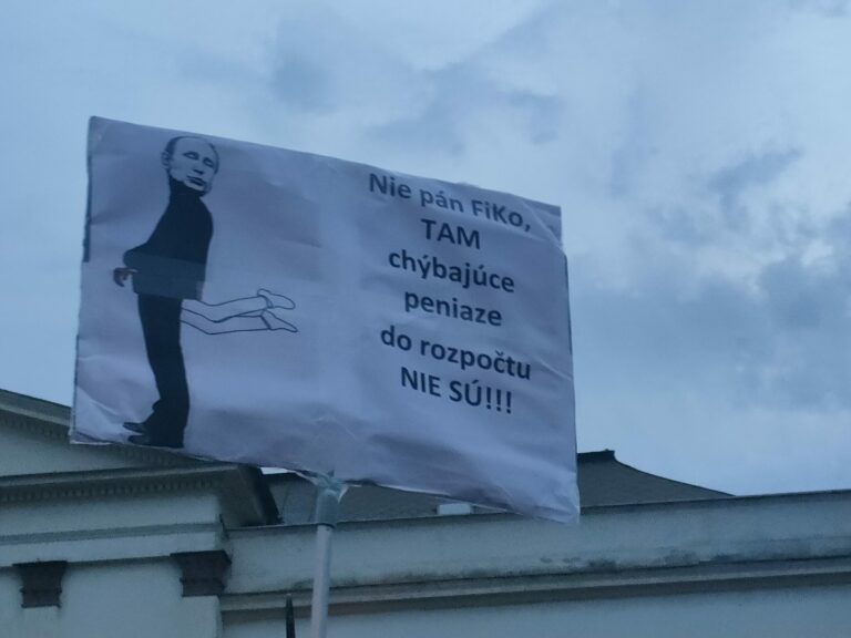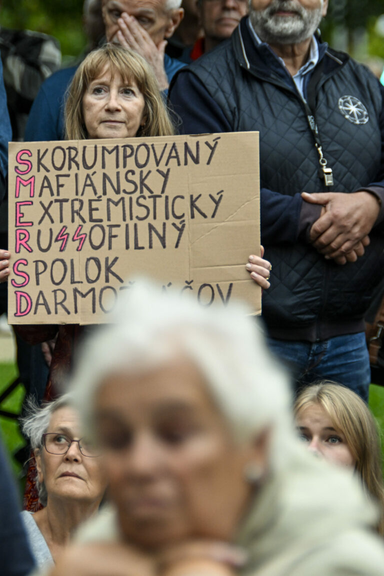 Účastníčka s transparentom počas protivládneho protestného zhromaždenia Proti konsolidácii organizovaného opozičnými stranami Progresívne Slovensko (PS), Sloboda a solidarita (SaS), Demokrati a Kresťanskodemokratické hnutie (KDH) na Námestí slobody v Bratislave. Bratislava, 23. september 2025. Foto: SITA/Milan Illík
