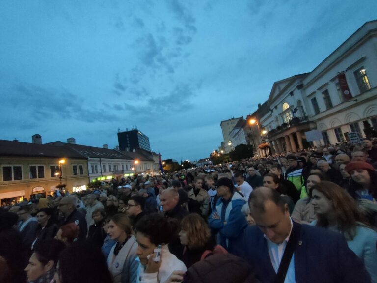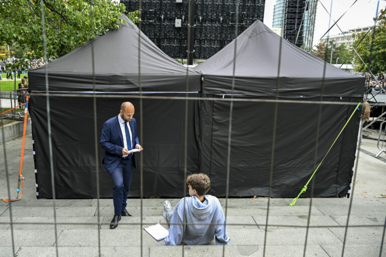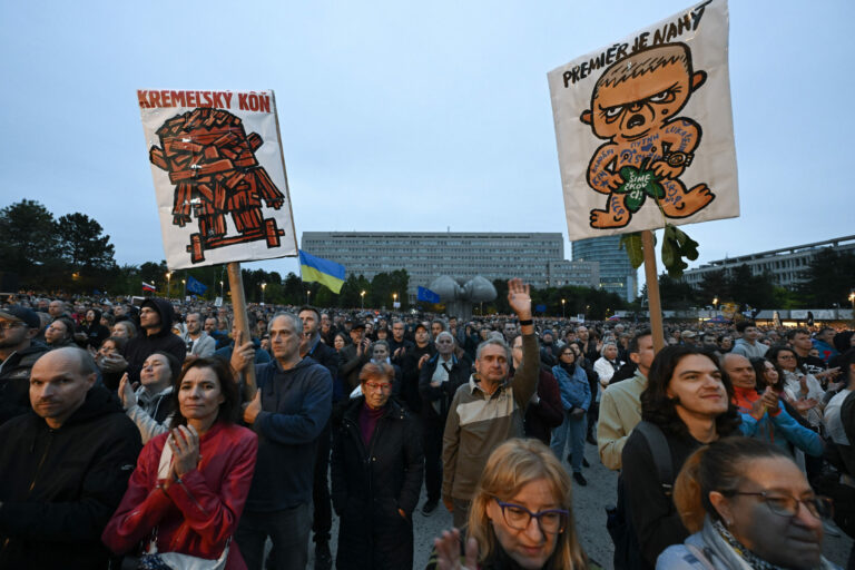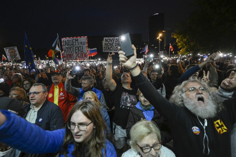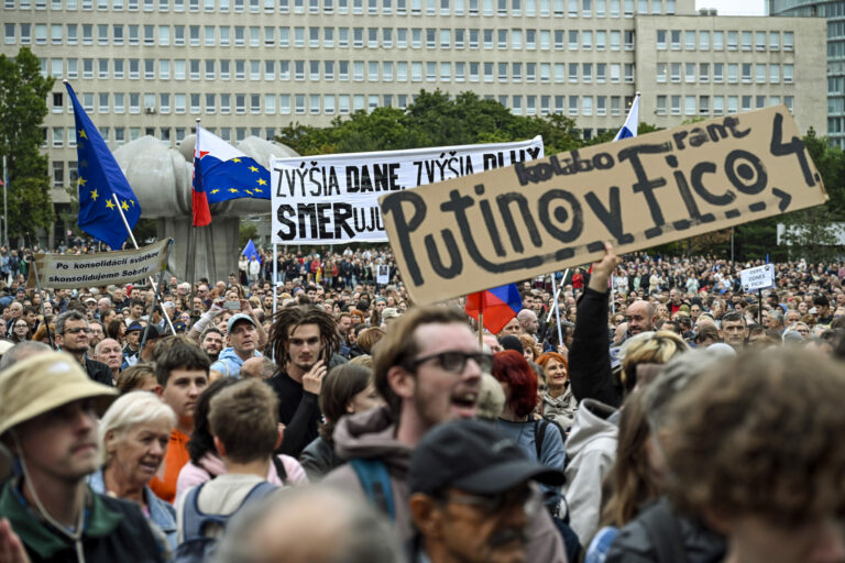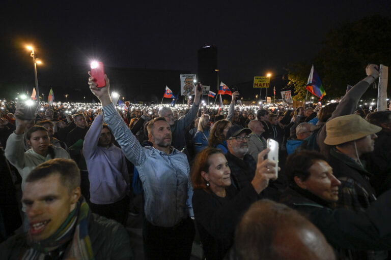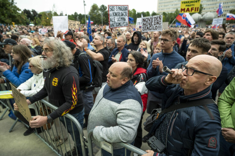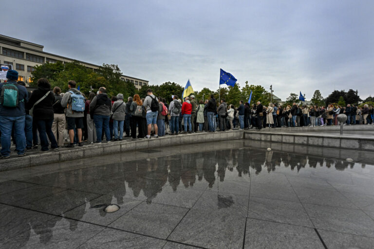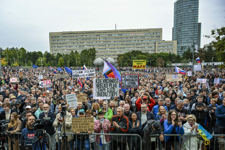Atmosféra počas protivládneho protestného zhromaždenia Proti konsolidácii organizovaného opozičnými stranami Progresívne Slovensko (PS), Sloboda a solidarita (SaS), Demokrati a Kresťanskodemokratické hnutie (KDH) na Námestí slobody v Bratislave. Bratislava, 23. september 2025. Foto: SITA/Milan Illík