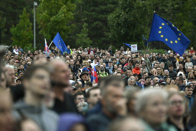 Účastníci s transparentmi a vlajkami počas protivládneho protestného zhromaždenia Proti konsolidácii organizovaného opozičnými stranami Progresívne Slovensko (PS), Sloboda a solidarita (SaS), Demokrati a Kresťanskodemokratické hnutie (KDH) na Námestí slobody v Bratislave. Bratislava, 23. september 2025. Foto: SITA/Milan Illík