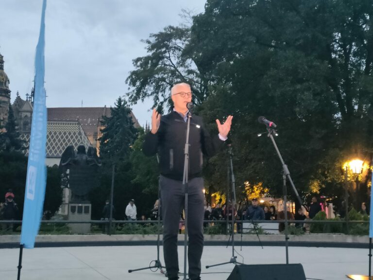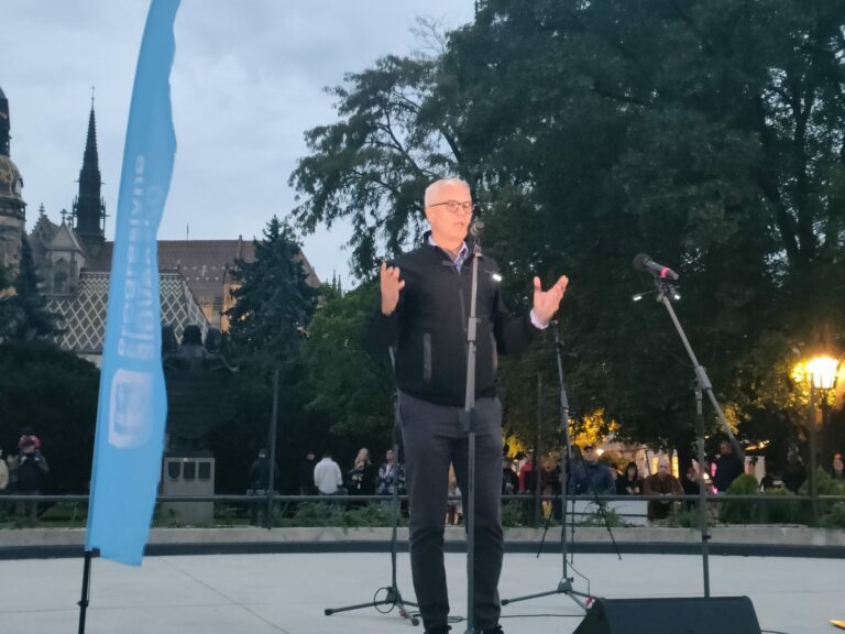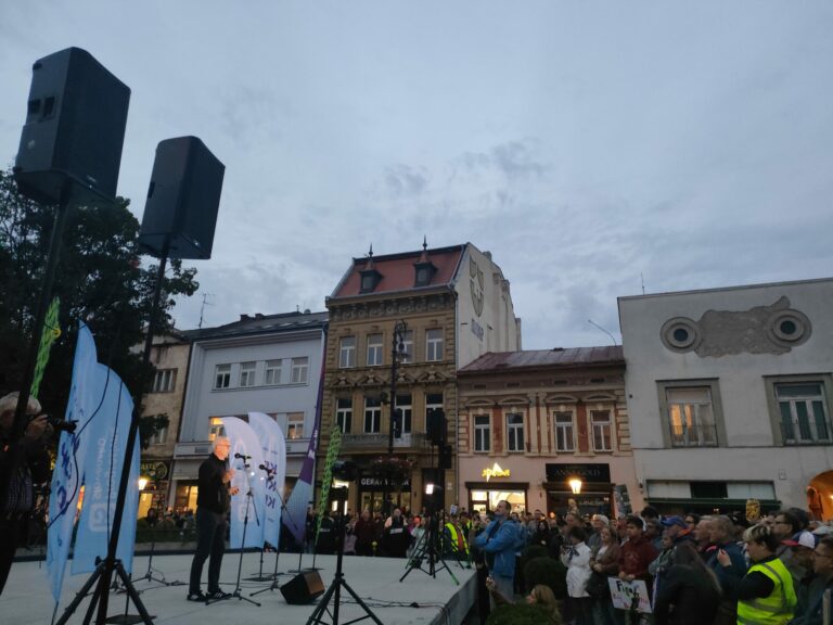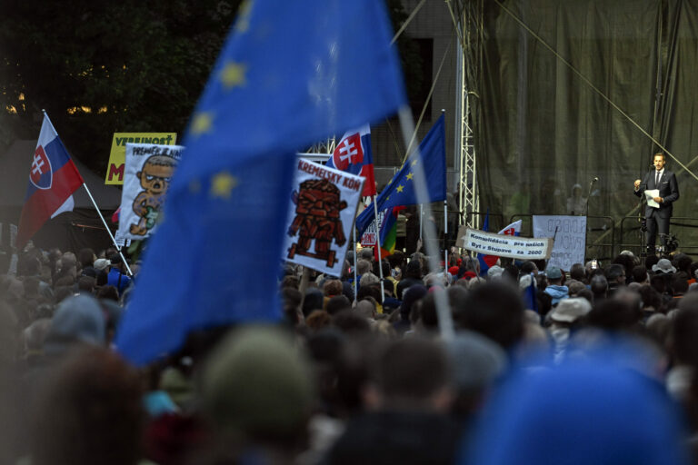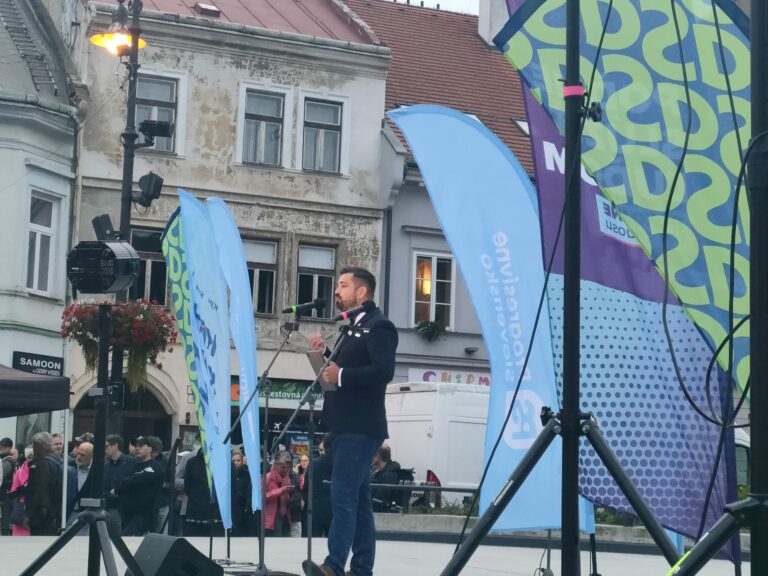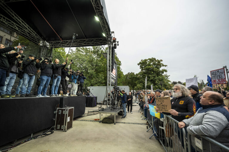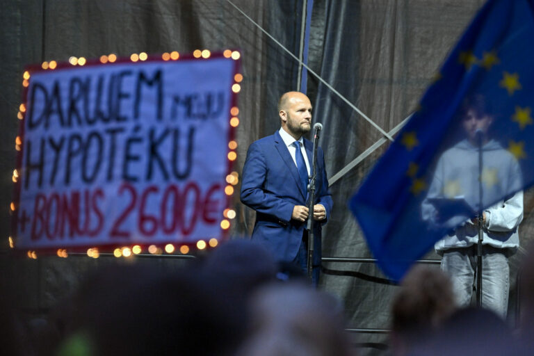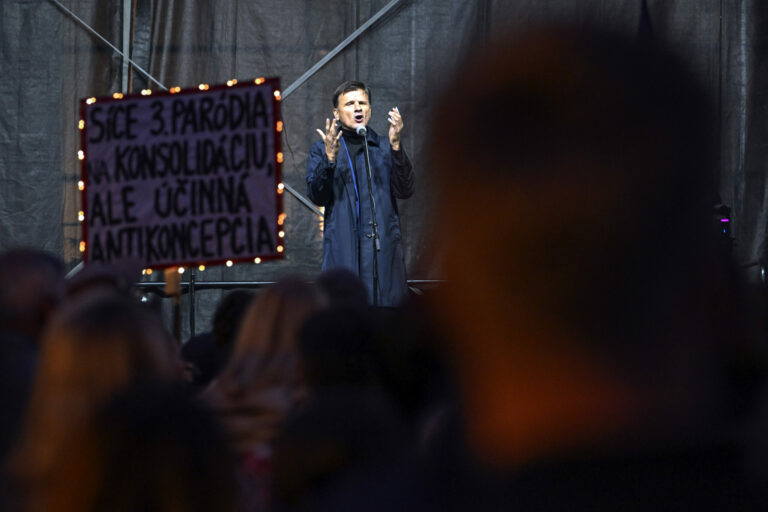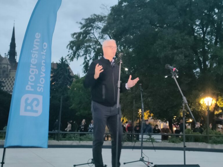 Predseda strany Progresívne Slovensko (PS) a poslanec Národnej rady SR Michal Šimečka (vľavo) počas protivládneho protestného zhromaždenia Proti konsolidácii organizovaného opozičnými stranami Progresívne Slovensko (PS), Sloboda a solidarita (SaS), Demokrati a Kresťanskodemokratické hnutie (KDH) na Námestí slobody v Bratislave. Bratislava, 23. september 2025. Foto: SITA/Milan Illík