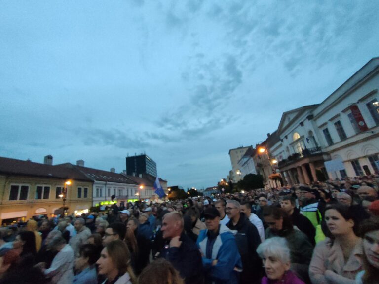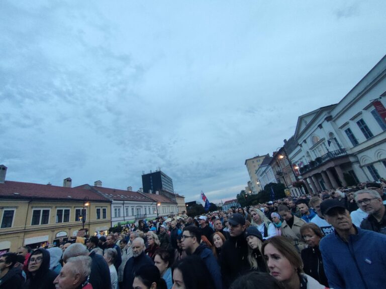 Účastníci počas hymny v rámci protivládneho protestného zhromaždenia Proti konsolidácii organizovaného opozičnými stranami Progresívne Slovensko (PS), Sloboda a solidarita (SaS), Demokrati a Kresťanskodemokratické hnutie (KDH) na Námestí slobody v Bratislave. Bratislava, 23. september 2025. Foto: SITA/Milan Illík