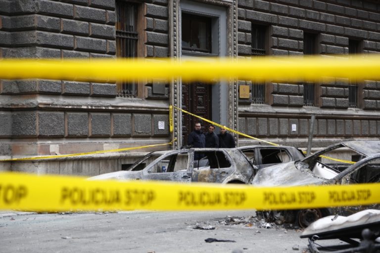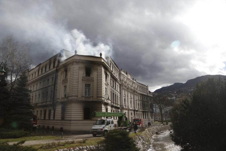 Protivládne protesty v Bosne v piatok 7. februára prerástli do rozsiahlych násilností, keď demonštranti podpálili aj niekoľko budov v hlavnom meste Sarajevo. Čierny dym sa niesol aj zo sídla bosnianskeho predsedníctva v Sarajeve. Sarajevo, 8. februára 2014. Foto: SITA/AP