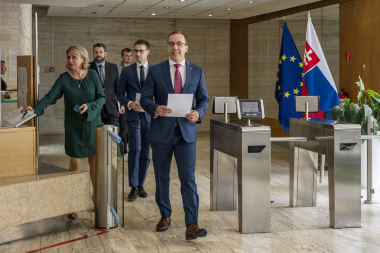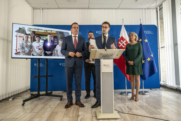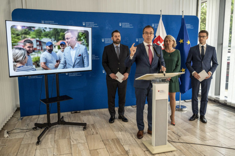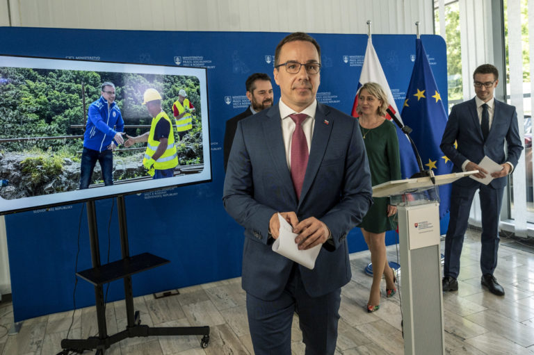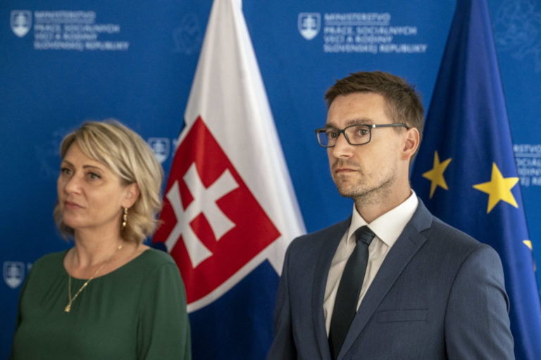 Minister práce, sociálnych vecí a rodiny SR Erik Tomáš (vpravo) počas príchodu na tlačový brífing do brífingovej miestnosti Ministerstva práce, sociálnych vecí a rodiny SR na tému: Práca namiesto dávok. Kto odmietne pracovnú ponuku, príde o dávku v hmotnej núdzi. Bratislava, 2. júl 2024. Foto: SITA/Milan Illík