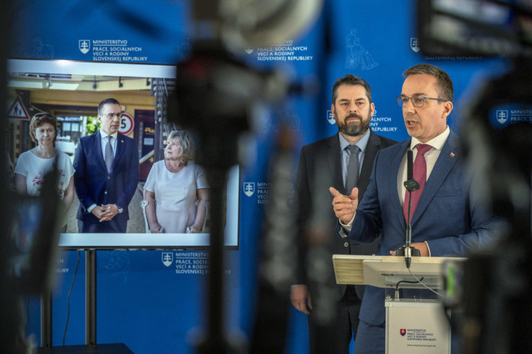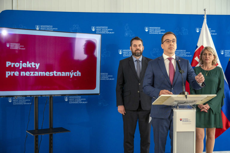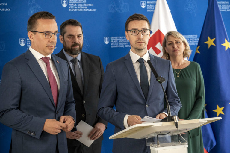 Zľava: Generálny riaditeľ a generálny tajomník Ústredia práce, sociálnych vecí a rodiny Peter Ormandy, minister práce, sociálnych vecí a rodiny SR Erik Tomáš a poradkyňa ministra práce, sociálnych vecí a rodiny Danica Lehotská počas tlačovej besedy ministra práce v brífingovej miestnosti Ministerstva práce, sociálnych vecí a rodiny SR na tému: Práca namiesto dávok. Kto odmietne pracovnú ponuku, príde o dávku v hmotnej núdzi. Bratislava, 2. júl 2024. Foto: archívne, SITA/Milan Illík