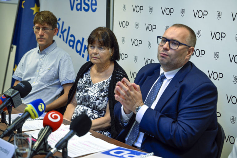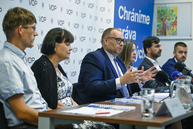 Verejný ochranca práv Róbert Dobrovodský (vľavo) počas tlačovej besedy v priestoroch Kancelárie verejného ochrancu práv (VOP) na tému: Chudoba znemožňuje ľuďom prístup k mnohým základným právam a dostáva ich do bezvýchodiskovej situácie. Problémy týchto ľudí už štát viac nemôže odkladať. Bratislava, 22. august 2024. Foto: SITA/Milan Illík