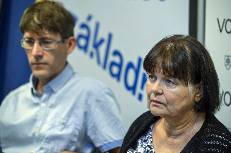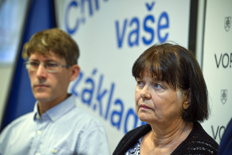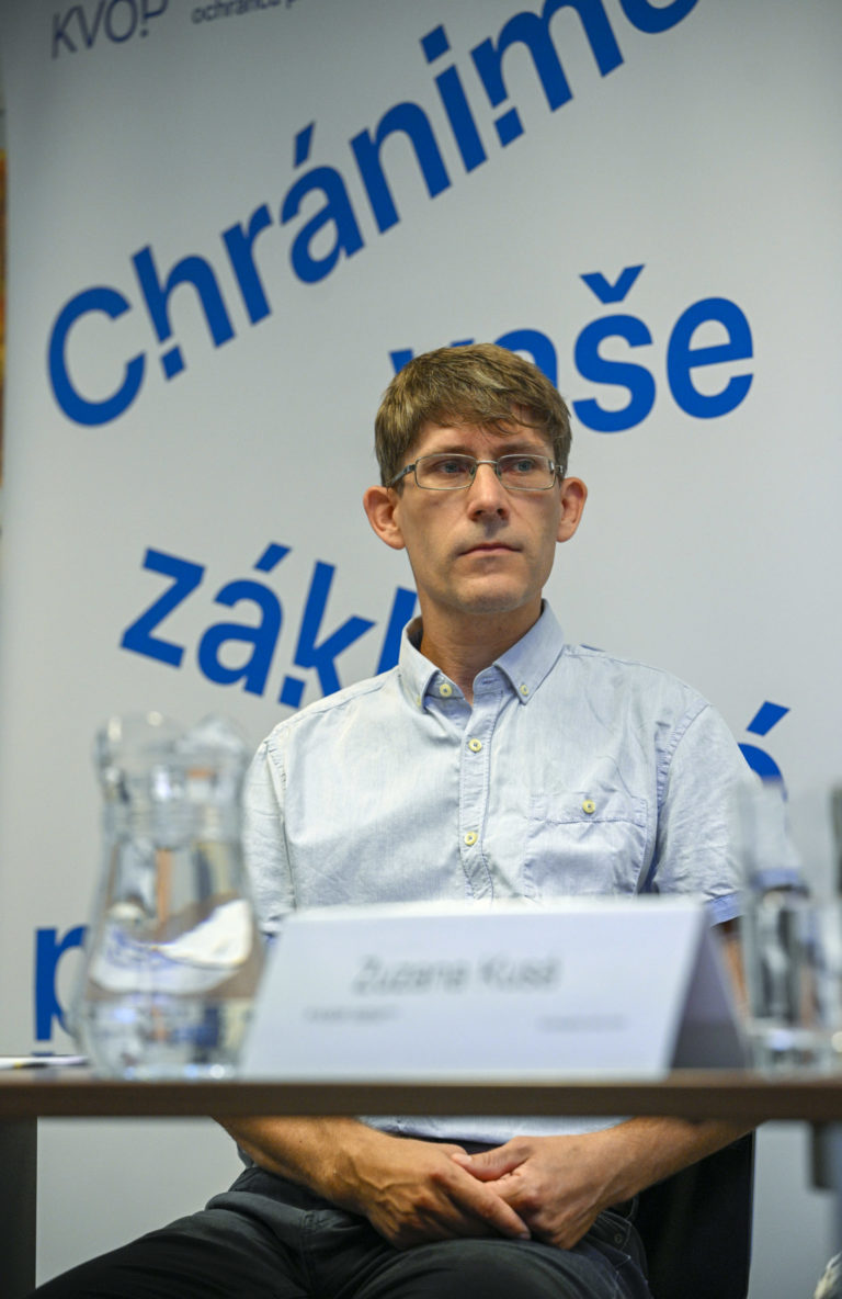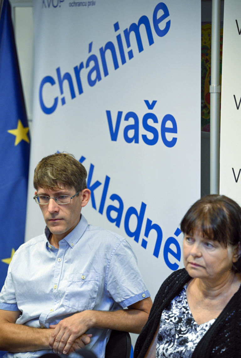 Zuzana Kusá zo Sociologického ústavu SAV a verejný ochranca práv Róbert Dobrovodský počas tlačovej besedy verejného ochrancu práv v priestoroch Kancelárie verejného ochrancu práv (KVOP) na tému: Chudoba znemožňuje ľuďom prístup k mnohým základným právam a dostáva ich do bezvýchodiskovej situácie. Problémy týchto ľudí už štát viac nemôže odkladať. Bratislava, 22. august 2024. Foto: SITA/Milan Illík