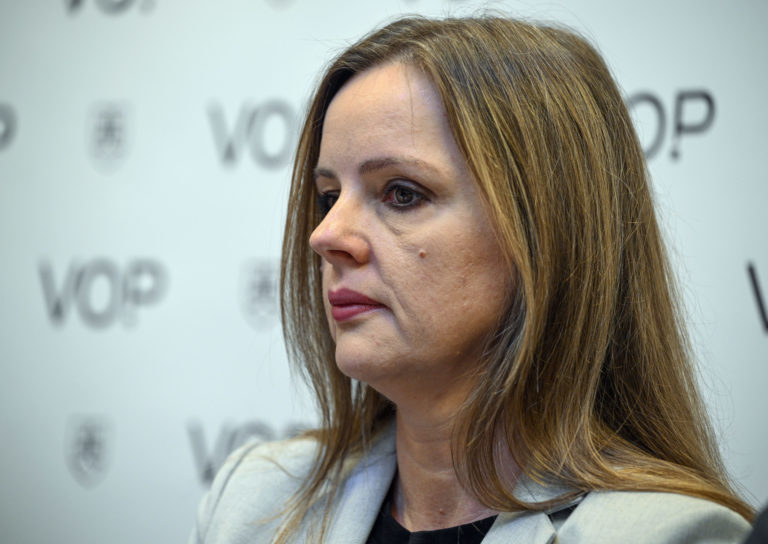 Riaditeľka odboru OHSKO KVOP Petra Fűkőová počas tlačovej besedy verejného ochrancu práv Róberta Dobrovodského v priestoroch Kancelárie verejného ochrancu práv (KVOP) na tému: Chudoba znemožňuje ľuďom prístup k mnohým základným právam a dostáva ich do bezvýchodiskovej situácie. Problémy týchto ľudí už štát viac nemôže odkladať. Bratislava, 22. august 2024. Foto: SITA/Milan Illík