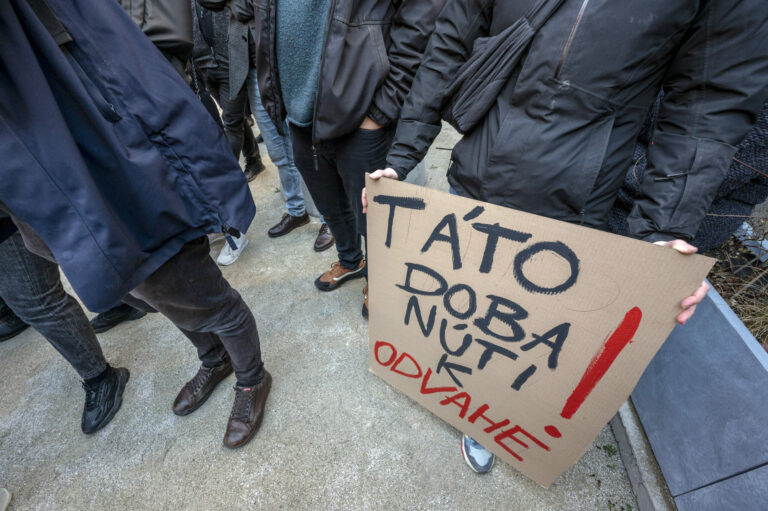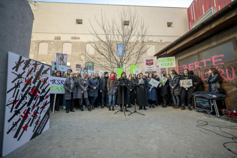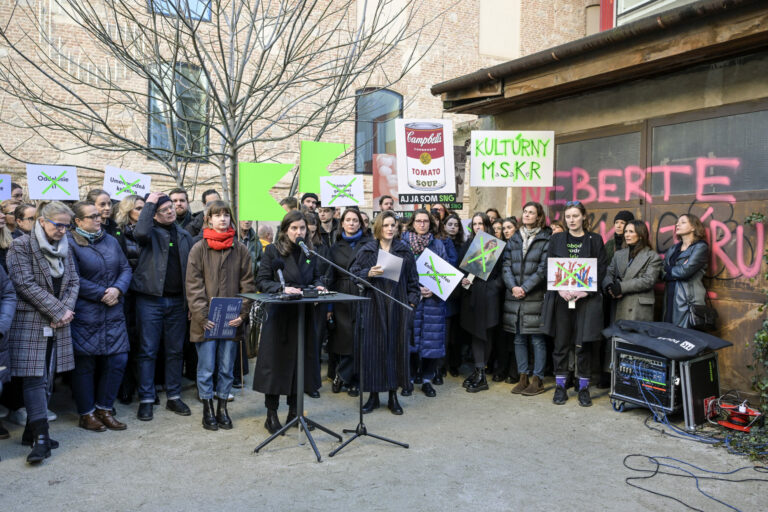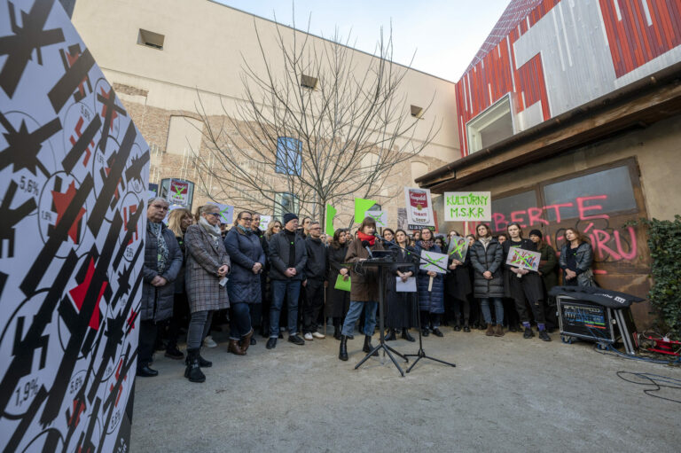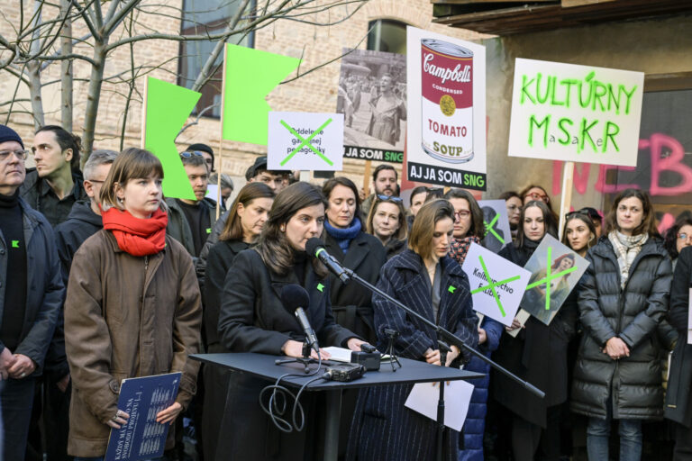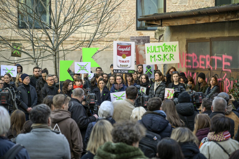 Nápis neberte nám kultúru počas tlačovej besedy nespokojných zamestnancov Slovenskej národnej galérie (SNG) na tému: Hromadný odchod zamestnancov. Bratrislava, 27. január 2025. Foto: archívne, SITA/Milan Illík
