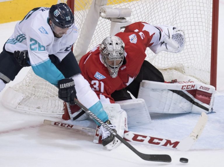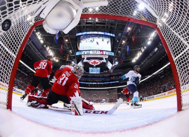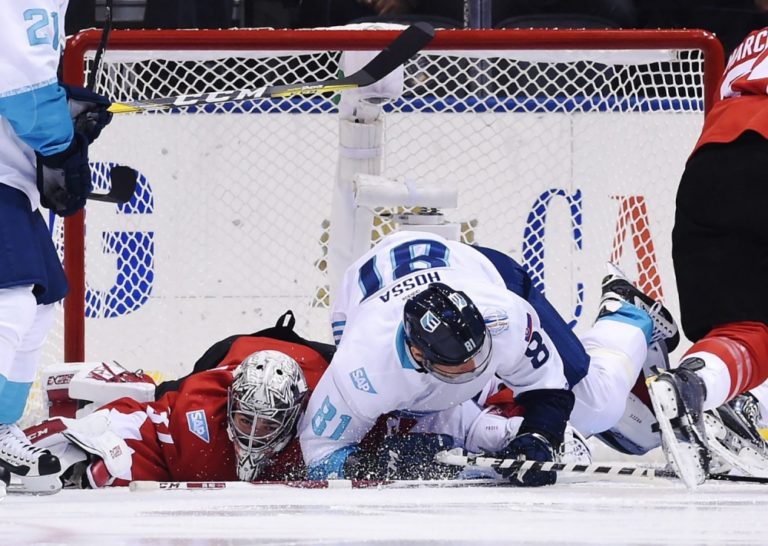 Kanadský brankár Corey Price a útočník výberu Európy Marián Hossa počas prvého finálového zápasu Svetového pohára. Toronto, 27. september 2016. Foto: Nathan Denette/The Canadian Press via AP