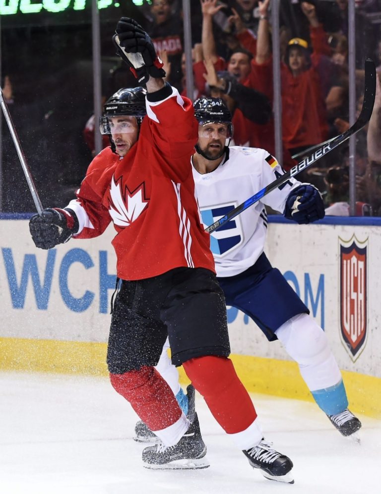 Obranca výberu Európy Denis Seidenberg sleduje šťastného strelca kanadského gólu Brada Marchanda počas prvého finálového zápasu Svetového pohára. Toronto, 27. september 2016. Foto: Nathan Denette/The Canadian Press via AP