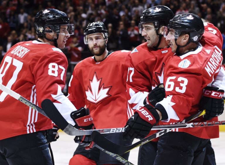 Hokejisti Kanady sa radujú z gólu Brada Marchanda počas prvého finálového zápasu Svetového pohára. Toronto, 27. september 2016. Foto: Nathan Denette/The Canadian Press via AP