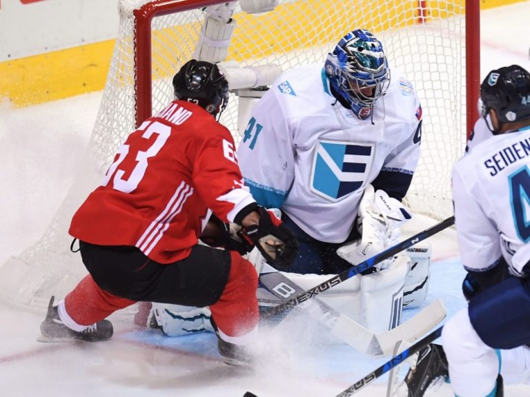 Kanadský útočník Steven Stamkos prekonáva brankára výberu Európy Jaroslava Haláka počas prvého finálového zápasu Svetového pohára. Toronto, 27. september 2016. Foto: Frank Gunn/The Canadian Press via AP