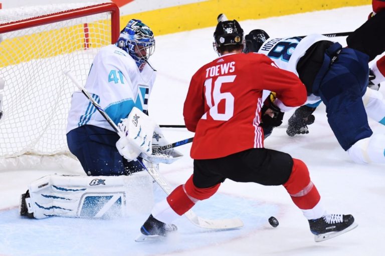 Kanadský útočník Jonathan Toews sa snaží prekonať brankára výberu Európy Jaroslava Haláka počas prvého finálového zápasu Svetového pohára. Toronto, 27. september 2016. Foto: Nathan Denette/The Canadian Press via AP