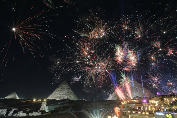 Ohňostroje nad historickým miestom pyramíd v Gíze na okraji Káhiry. Egypt, 1. januára 2026. Foto: AP Photo/Amr Nabil