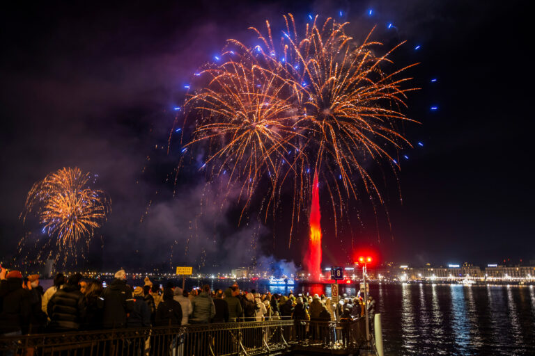 Ohňostroj osvetľuje oblohu v Ženevskom zálive za slávnou fontánou „Le Jet d'Eau“ počas osláv Nového roka v Ženeve. Švajčiarsko, 1. januára 2026. Foto: Salvatore Di Nolfi/Keystone via AP