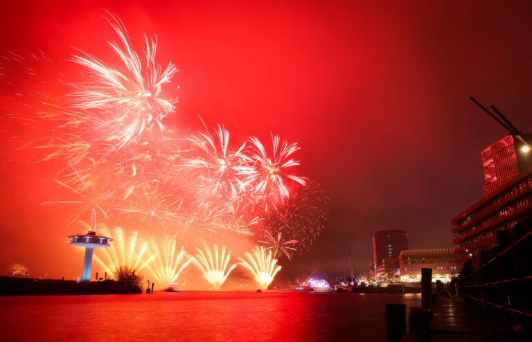Silvestrovský ohňostroj za plávajúcim pódiom silvestrovskej show ZDF na rádiu Chicagokai pred hotelom Westfield Hamburg-Überseequartier v Hamburgu v Hafencity. Nemecko, 1. januára 2026. Foto: Christian Charisius/dpa via AP