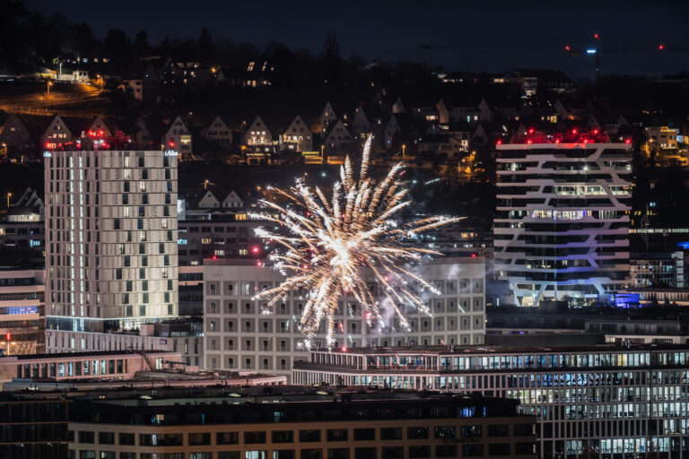 Ohňostroje nad centrom mesta Stuttgart na Silvestra. Nemecko, 31. decembra 2025. Foto: Silas Stein/dpa via AP