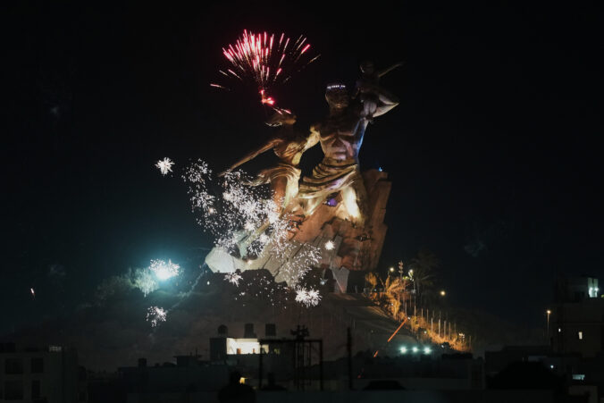 Ohňostroj osvetľuje Pamätník africkej renesancie v Dakare. Senegal, 1. januára 2026. Foto: AP Photo/Misper Apawu