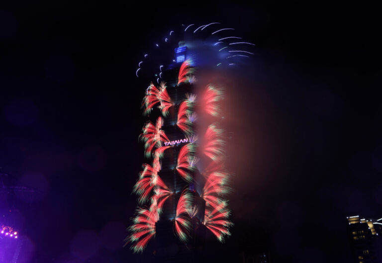 Ohňostroje explodujú z budovy Taipei 101 počas osláv Nového roka v Taipei. Taiwan, 1. januára 2026. Foto: AP Photo/Chiang Ying-ying