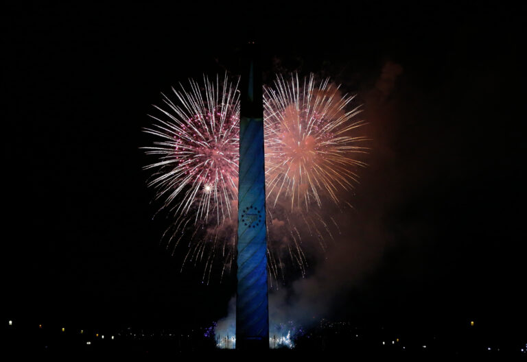Washingtonský monument je osvetlený ako sviečka a ohňostroj v pozadí na oblohe ako súčasť osláv 250. výročia Spojených štátov. Spojené štáty, 1. januára 2026. Foto: AP Photo/Rahmat Gul
