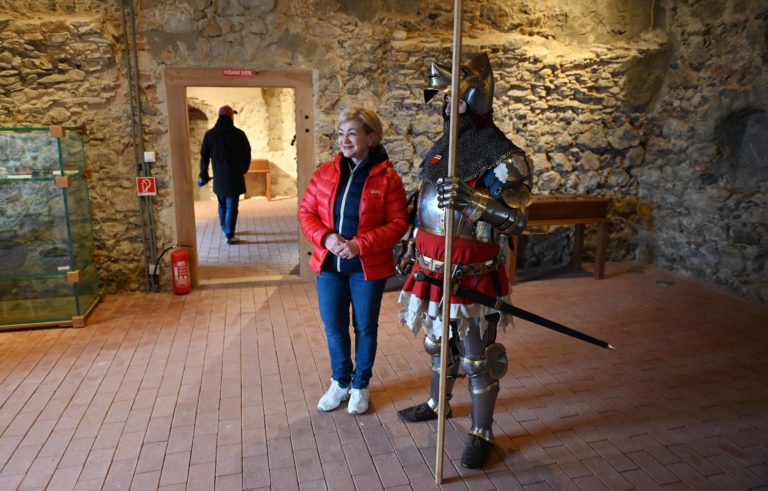 Na hrade Beckov otvorili stálu expozíciu západného paláca hradu kde si návštevníci môžu prehliadnuť exponáty danej doby, jedinečné hovoriace obrazy alebo atraktívne kukátkové steny a dostať sa do komplexu hradu, ktorý bol zatiaľ verejnosti uzavretý. Beckov, 1. marec 2024. Foto: SITA/Tomáš Somr