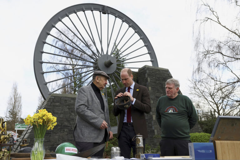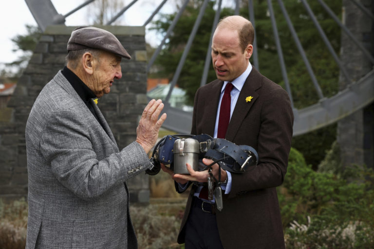 Britský princ William sa stretáva s predsedom pamätníka Gresfordskej katastrofy Alanom Jonesom počas návštevy pamätníka Gresford Colliery Disaster vo Wrexhame. Foto: Molly Darlington/Pool via AP