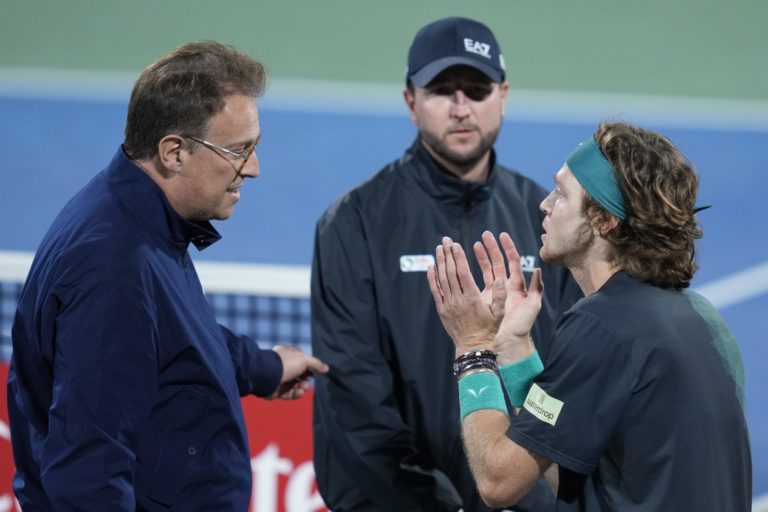 Supervízor ATP Roland Herfel (vľavo) diskvalifikuje Andreja Rubľova počas jeho semifinálového zápasu s Alexandrom Bublikom z Kazachstanu na tenisovom turnaji. Foto: SITA/AP