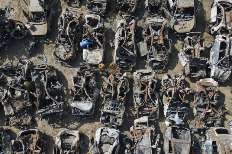 Izraelské bezpečnostné sily kontrolujú obhorené vozidlá po krvavom cezhraničnom útoku militantov Hamasu zo 7. októbra pri meste Netivot v južnom Izraeli. Foto: SITA/AP.