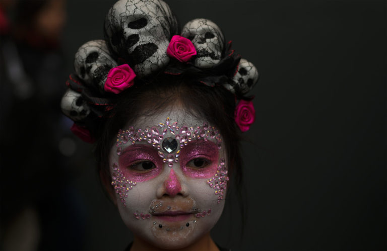 Dievča s tvárou namaľovanou ako „Catrina“ zbiera cukríky počas osláv Dňa mŕtvych v La Paz v Bolívii. Foto: SITA/AP.