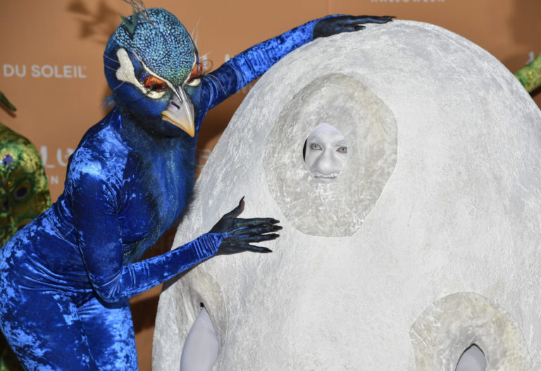 Heidi Klum (vľavo) ako páv a jej manžel Tom Kaulitz ako pávie vajce prichádzajú na halloweensku párty v maskách. Foto: Photo by Evan Agostini/Invision/AP.