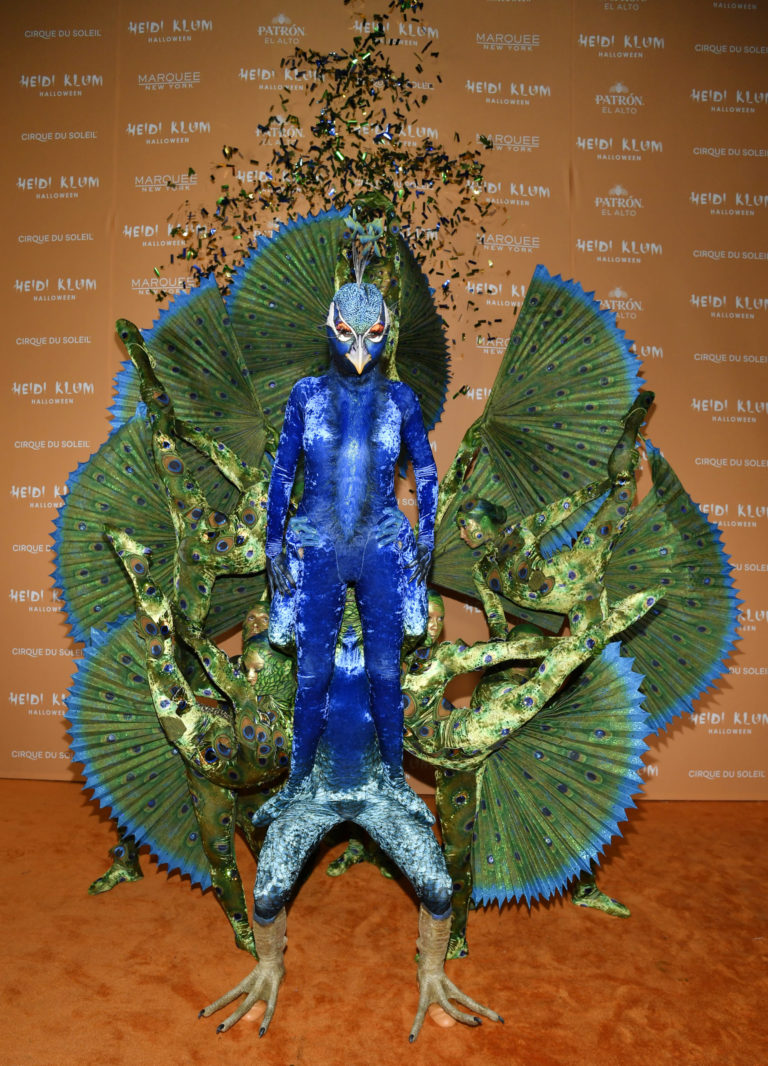 Heidi Klum (uprostred v modrom) prišla na svoju halloweensku párty ako páv. Foto: Photo by Evan Agostini/Invision/AP.