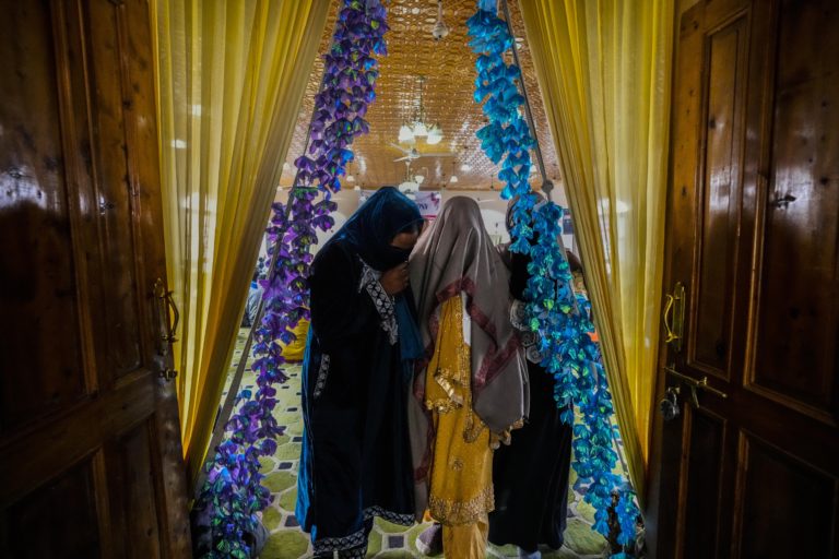 Kašmírska moslimská dievčina v svadobných šatách prichádza na hromadnú sobášnu udalosť do Šrínagaru. Foto: SITA/AP.