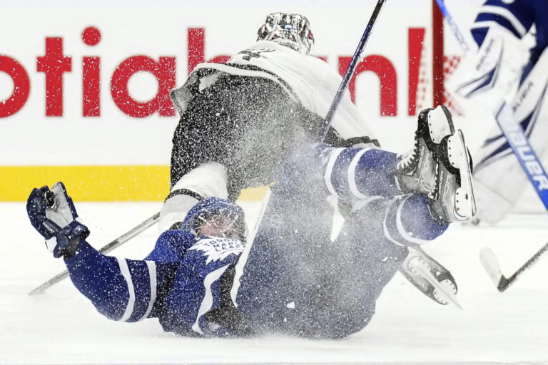 Hráč Toronta Maple Leafs' Mitchell Marner zostal na ľade po zásahu hráča Los Angeles Kings počas druhej tretiny hokejového zápasu NHL. Foto: SITA/AP.