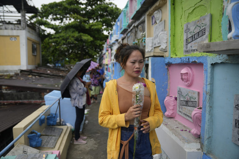 Žena drží kvety, keď sa prechádza popri hrobkách na severnom cintoríne v Manile na Filipínach. Foto: SITA/AP.