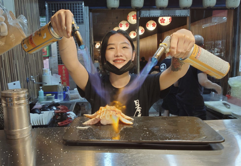 Predavačka griluje mäso a usmieva sa na nočnom trhu v taiwanskom Taipei. Foto: SITA/AP.