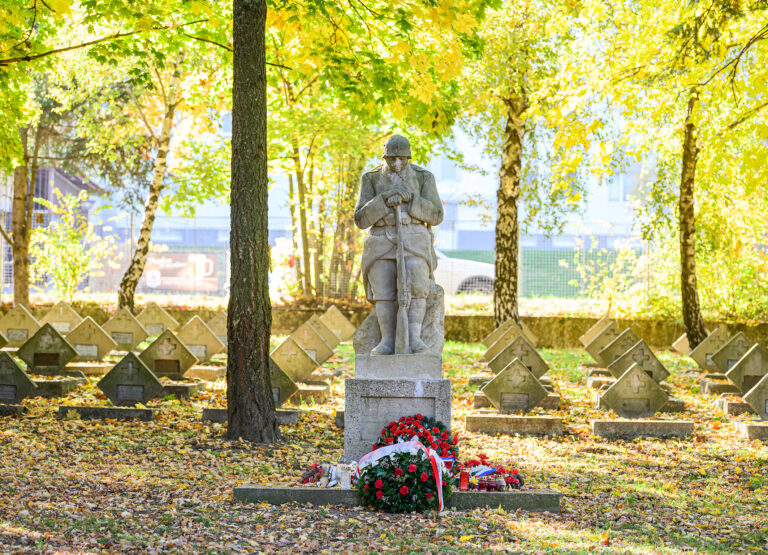Centrálne situovaný pomník so sochou vojaka na Vojenskom cintoríne v Nitre. Autorom cochy je nitriansky sochár Július Bártfay.. Vojenský cintorín vznikol v roku 1915 a sú tu pochovaný vojaci bez ohladu na príslušnosť k armáde, národu, či národnosti. Celkovo je tu pochovaných viac než 400 vojakov a civilistov vrátane detí.. Nitra, 29. október 2024. Foto: SITA/Martin Havran