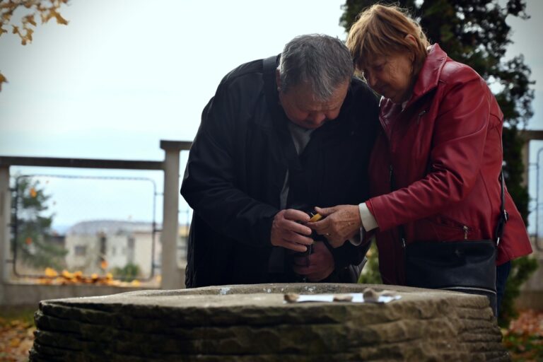 Návštevníci prírodného cintorína Záhrada spomienok vo Zvolene pri obradnom mieste krátko pred sviatkom Všetkých svätých. Zvolen, 31. október 2024. Foto: SITA/Jakub Julény.