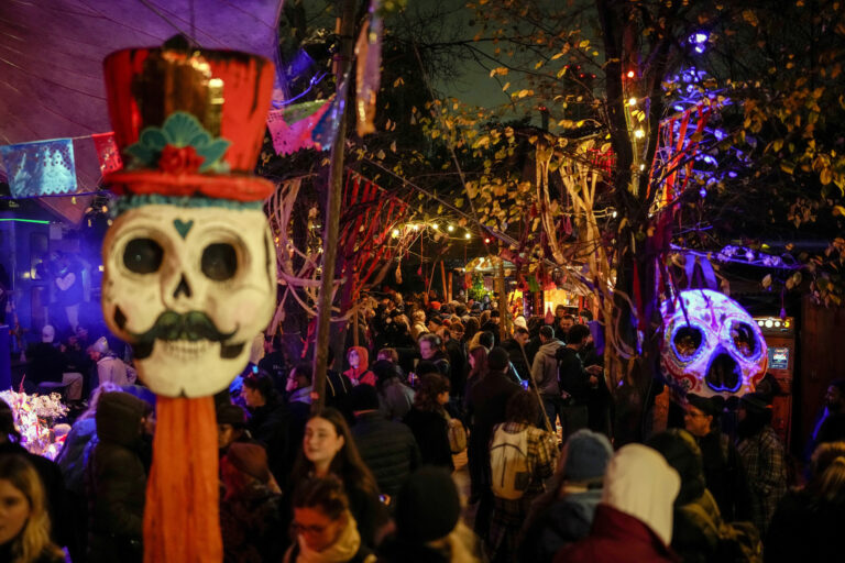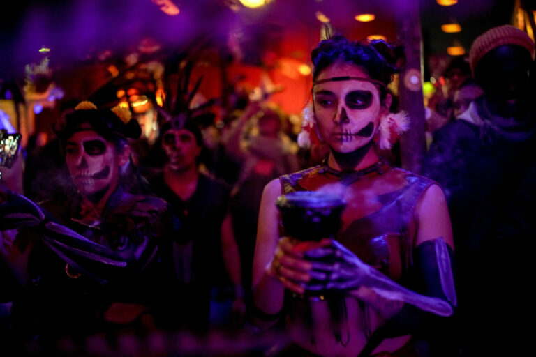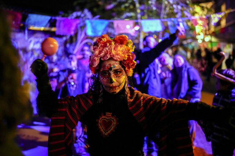 Mexická aztécka skupina počas vystúpenia ku Dňu mŕtvych v Berlíne. Foto: SITA/AP.