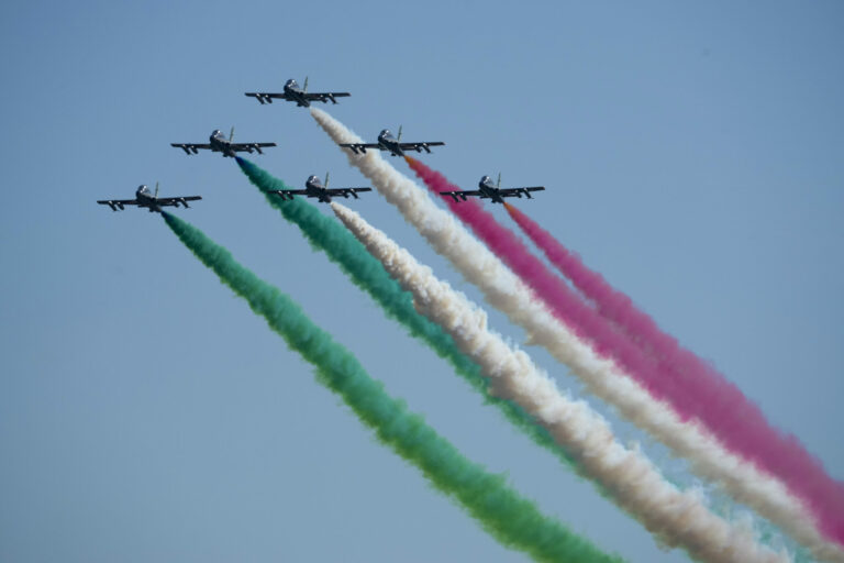 Talianske lietadlá počas akrobatického čísla vypustili trikolóru vo farbách talianskej vlajky. Foto: SITA/AP.