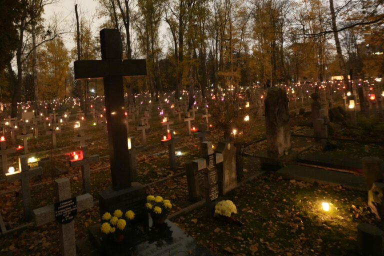 Pohľad na horiace sviečky na cintóríne počas Dňa všetkých svätých vo Varšave. Foto: SITA/AP.