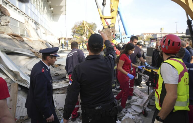 Pracovníci záchrannej služby kontrolujú miesto nešťastia po tom, čo sa zrútila betónová strecha nad železničnou stanicou v Novom Sade. Foto: Interior Ministry of Serbia via AP.