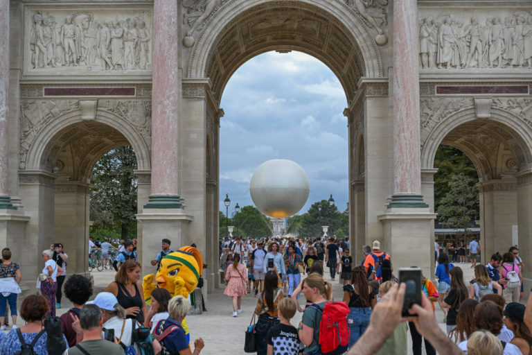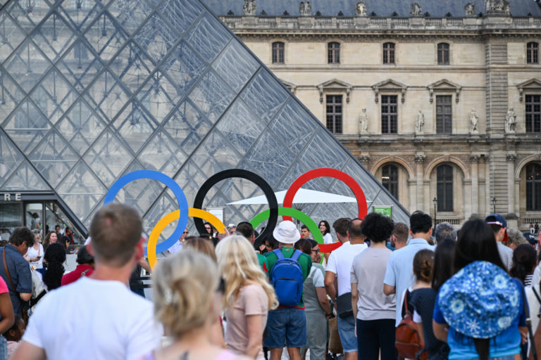 Pohľad na olympijské kruhy a návštevníkov pred Múzeom Louvre počas XXXIII. letných olympijských hier 2024 v Paríži. Paríž, 9. august 2024. Foto: SITA/Martin Medňanský