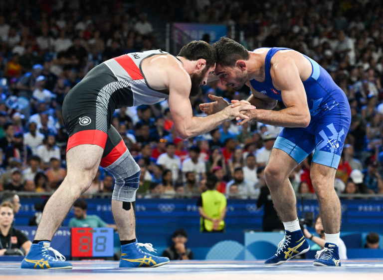 Zľava: Slovenský zápasník Tajmuraz Salkazanov a zápasník z Tímu nezávislých športovcov Mahamedkhabib Kadžimehamedov v opravnom súboji v hmotnostnej kategórii do 74 kg v zápasení vo voľnom štýle v rámci XXXIII. Olympijských hier Paríž 2024. Paríž, 10. august 2024. Foto: SITA/Martin Medňanský