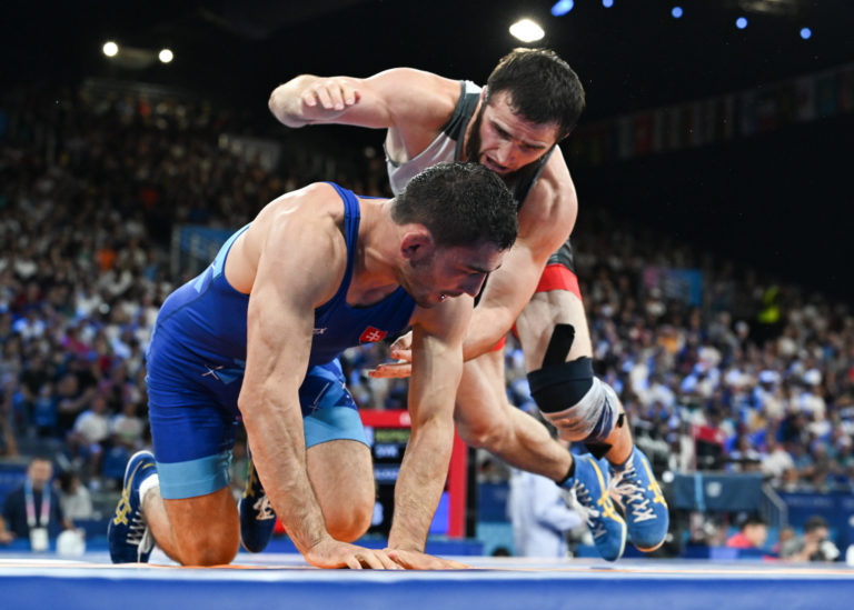 Sprava: Slovenský zápasník Tajmuraz Salkazanov a zápasník z Tímu nezávislých športovcov Mahamedkhabib Kadžimehamedov v opravnom súboji v hmotnostnej kategórii do 74 kg v zápasení vo voľnom štýle v rámci XXXIII. Olympijských hier Paríž 2024. Paríž, 10. august 2024. Foto: SITA/Martin Medňanský