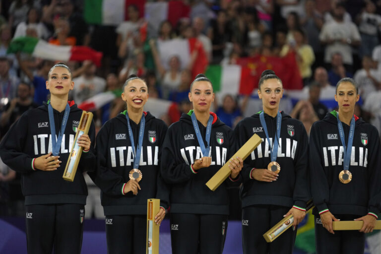 Tím Talianska po zisku bronzovej medaily v súťaži v skupinovom viacboji v rytmickej gymnastike. Foto: SITA/AP