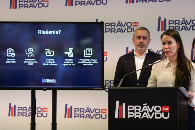 Sprava: Expertka na životné prostredie Zuzana Krajčovičová a ekonóm a analytik Martin Halás počas tlačovej konferencie politickej strany Právo na Pravdu (PRAVDA) o témach: Ohrozené ženy, čierne peniaze, politici kryjú taxi aplikácie a postavili ich nad zákon! Bratislava, 10. február 2026. Foto: SITA/strana Právo na pravdu