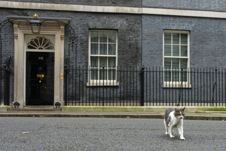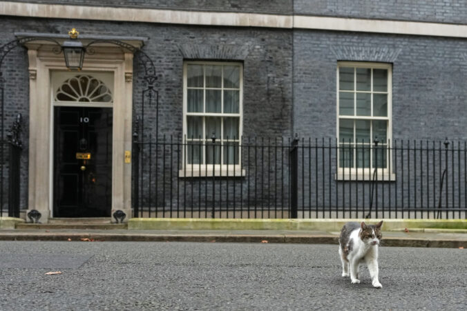 Larry, mačka s funkciou Chief Mouser pri Kancelárii kabinetu britskej vlády, prechádza Downing Street v Londýne. Anglicko, 10. februára 2026. Foto: AP Photo/Alastair Grant